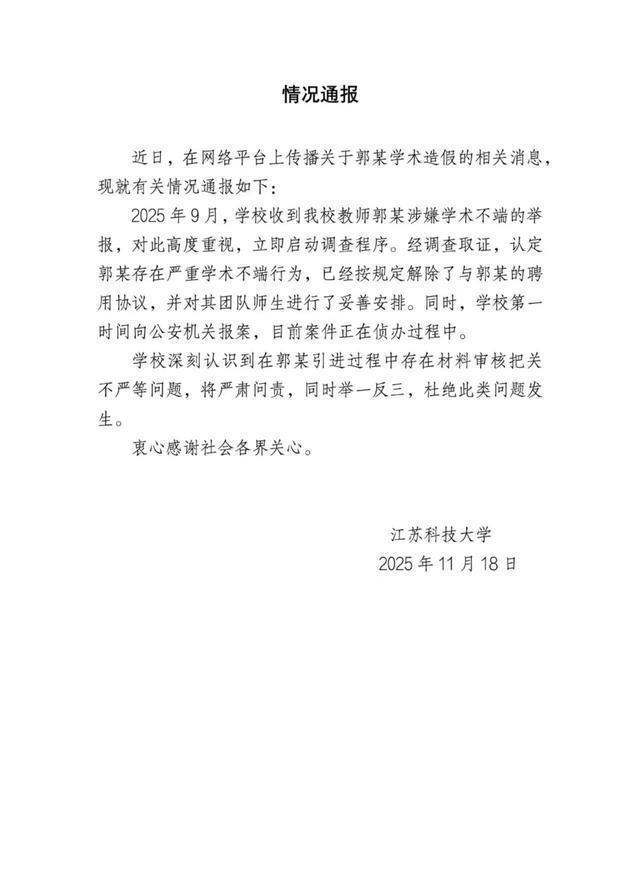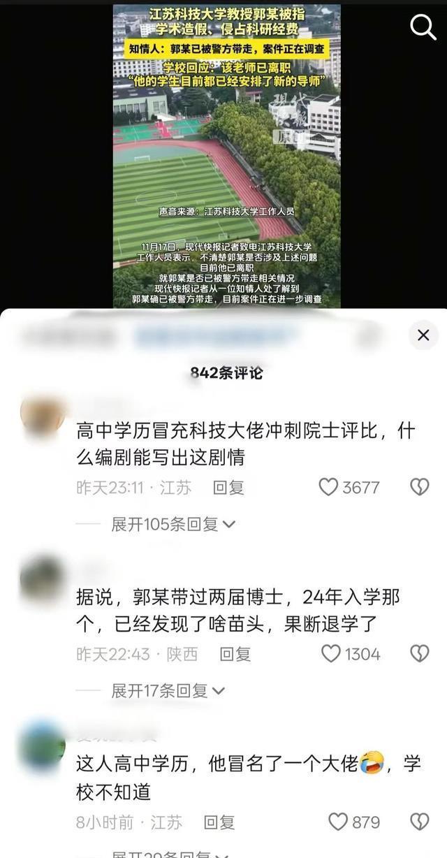 【事件回顾】 11月18号,江苏科技大学发了通报,说这个主角——郭某,因为学历造假、学术造假,已经被学校解聘了。而且事情没完,人已经被警方带走,正在接受调查。 这事儿有多离谱呢?咱们来看看网民的爆料:这位郭教授,号称自己发表了170多篇SCI论文,被引用了6000多次。好家伙,这数据放在哪个领域都是大神级别的吧?结果呢?这170篇论文,愣是“查无此文”。不仅论文是假的,连他那个“光鲜亮丽”的博士学历也是假的,底色竟然是——高中毕业。